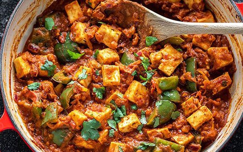 Homemade cottage cheese chunks cooked with green pepper served as thick gravy from onion, tomatoes and cream