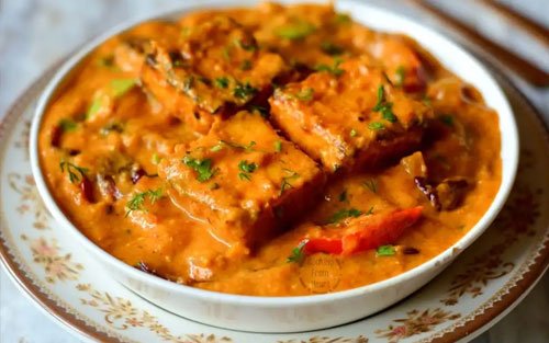 Chunks of cottage cheese, bell peppers and onion marinated in yogurt, lime juice and Indian spices cooked in thick onion tomato and cream sauce